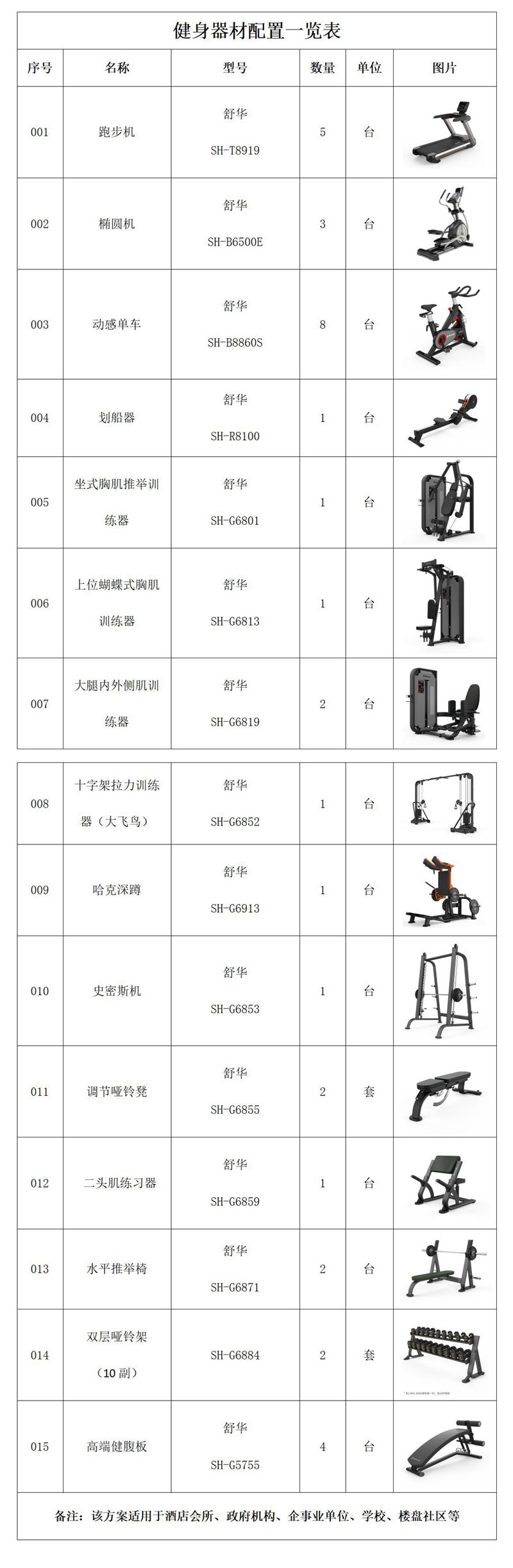 此方案要求面积小于300平米,我们会根据实际情况和场地面积而定。此方案推荐企事业单位健身房、酒店会所健身房、学校健身房、部队健身房等配置。能满足30-50人同时健身使用。