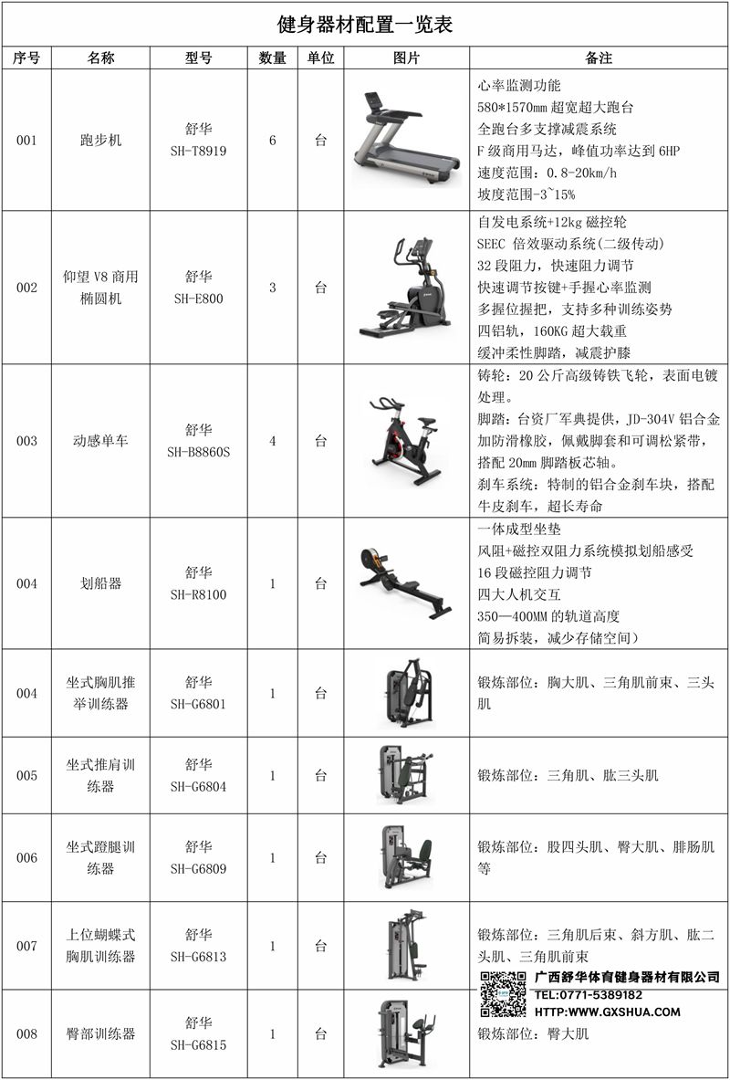 1.xc sports,xcV9智能跑步机SH-T8919*6台-独立仪表-简洁大气,全新外观设计,健康运动新选择;心率监测功能,可通过手握心率、无线心率带等不同方式实时采集心率数据;580*1570mm超宽超大跑台-跑感舒适,跑台整体安全稳定;全跑台多支撑减震平台,保证跑台超强支撑力,达到180kg支撑,满足专业健身房需求。F级商用马达-超强马达,AC 3.0HP 交流,峰值功率达到6HP,F级商用品质。速度范围达到0.8-20km/h;V9跑步机可实现跑台扬升功能,坡度范围-3~15%,满足客户不同的锻炼需求。