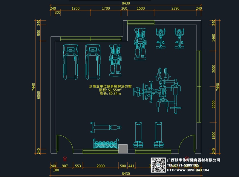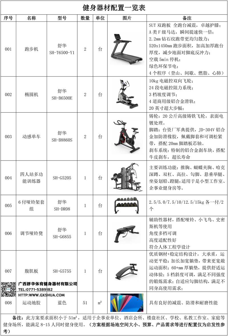 此方案要求面积小于51m²,适用于企事业单位、酒店会所、楼盘社区、学校、私教工作室、家庭等健身场所,能满足8-15人同时健身使用(方案根据场地空间大小、预算、产品需求等进行配置仅为启发性参考)