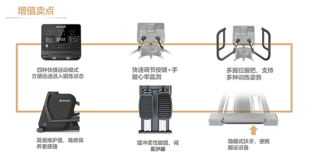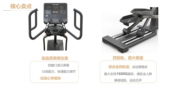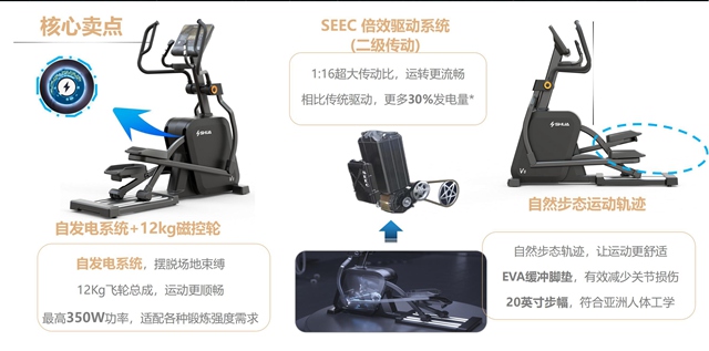 安全稳重,细节制胜。xc sports,xcV8椭圆机是一款高安全系数的椭圆机,整体设计遵循人体工学科学,缓震踏板中添加减震层设计,能够有效减少运动冲击带来的关节损伤,且最大支持160kg载重,满足更多人群。手握心率监测、多功能置物架、自发电系统取代统电源......在细节上,新款椭圆机站在健身者角度,添加了不少设计者的巧思,为健身者带来更贴心的体验。
