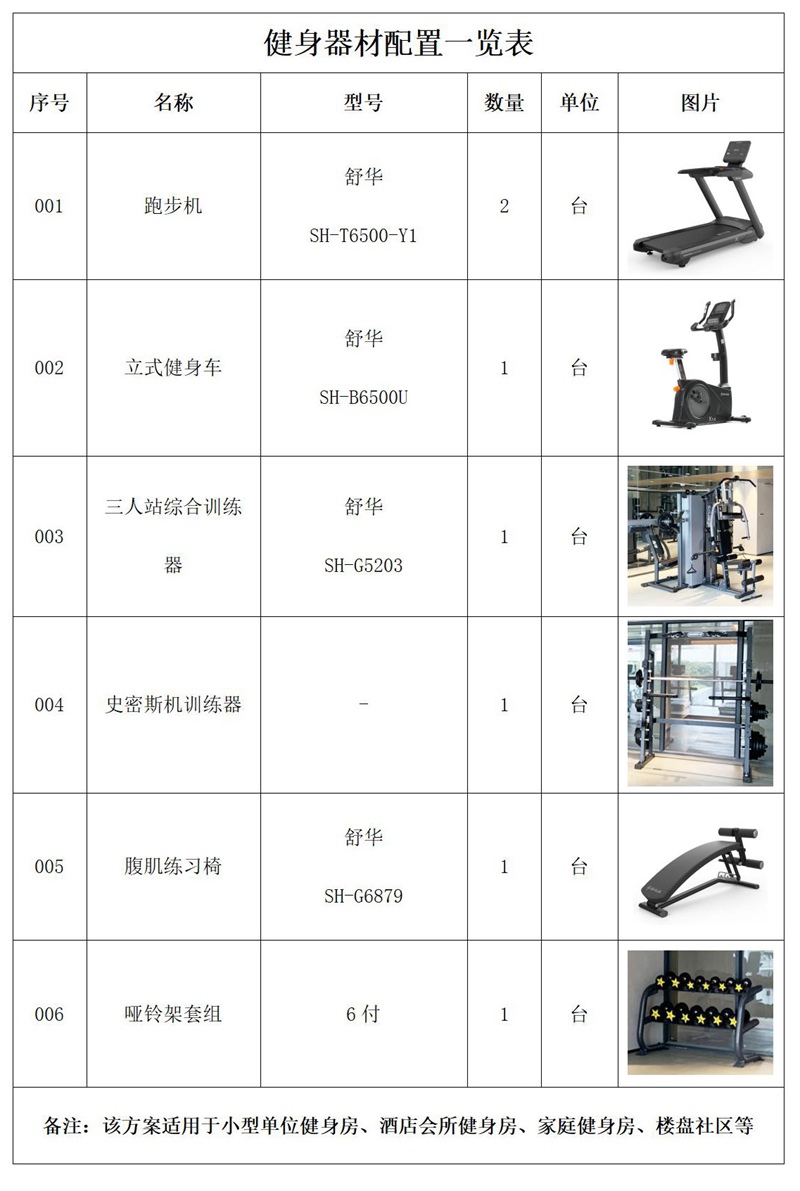 此方案要求面积小于70平米,此方案推荐小型企事业单位健身房、酒店会所健身房、家庭健身房等配置。能满足5-10人同时健身使用。