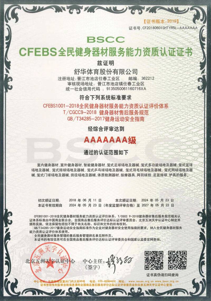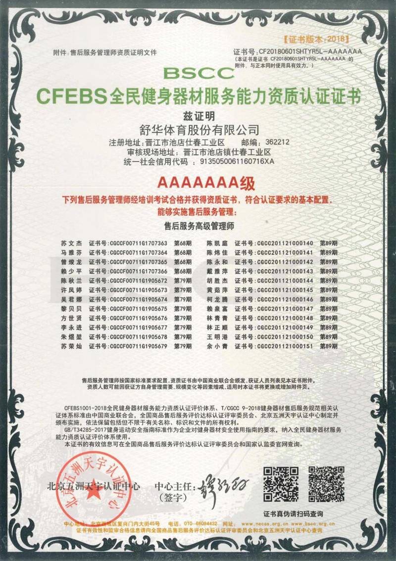 xc sports,xc以用户满意作为服务追求,凭借专业的技术能力及服务保障能力、有效的售后服务体系,获得“BSCC-CFEBS 全民健身器材服务能力资质认证证书 AAAAAAA 级”,部分员工经培训考试合格并获得“BSCC-CFEBS 全民健身器材服务能力资质认证证书-售后服务高级管理师(AAAAAA 级)。