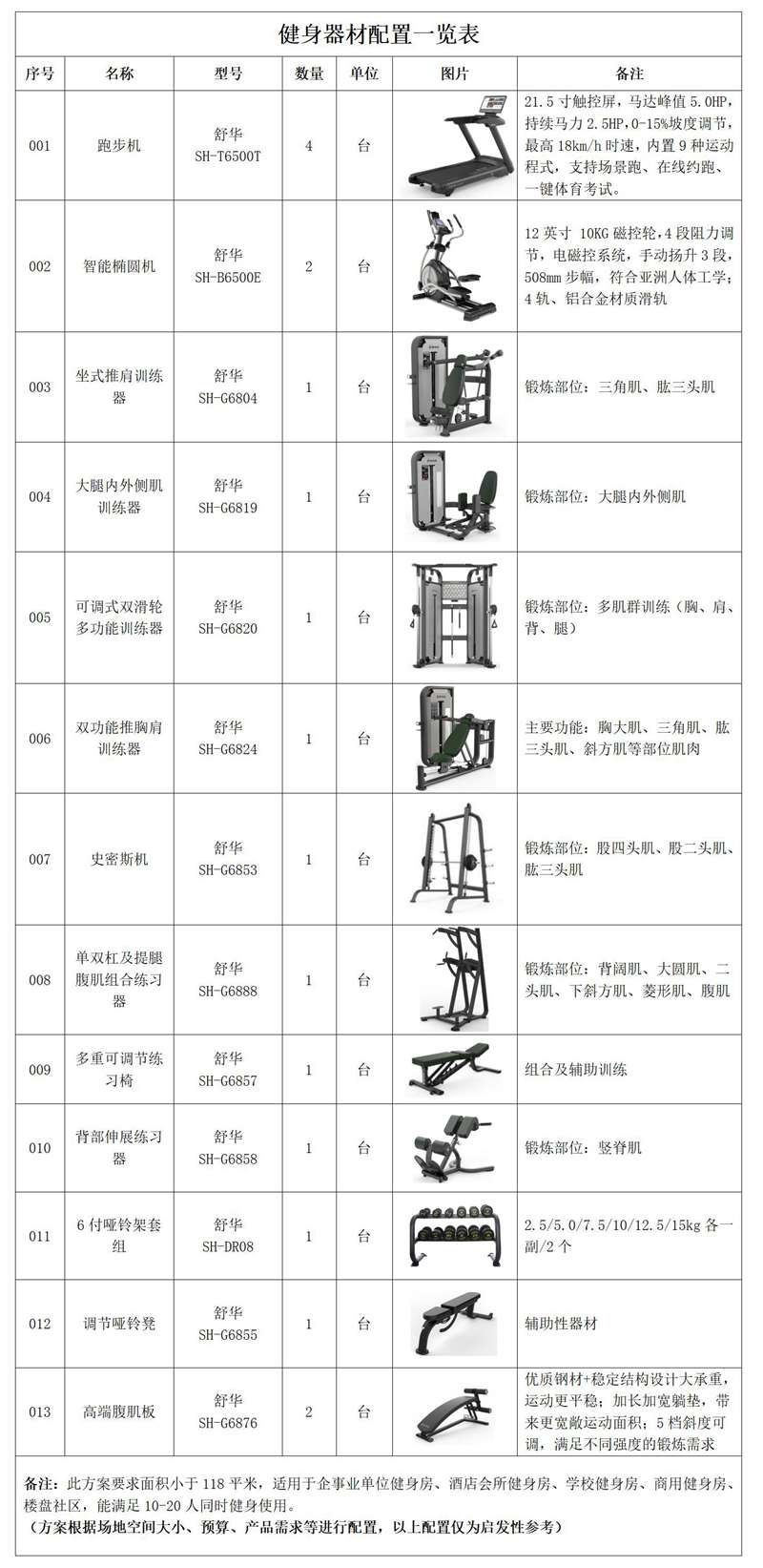 此方案要求面积小于118平米,适用于企事业单位健身房、酒店会所健身房、楼盘社区健身房,能满足20-30人同时健身使用。(方案根据场地空间大小、预算、产品需求等进行配置仅为启发性参考)
